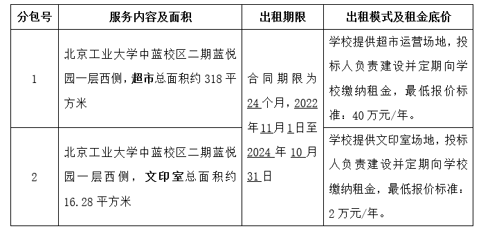 中天信遠(yuǎn)國(guó)際招投標(biāo)咨詢(北京)有限公司受北京工業(yè)大學(xué)的委托,對(duì)“北京工業(yè)大學(xué)中藍(lán)超市及文印室公開招租項(xiàng)目”(招標(biāo)編號(hào):ZTXY-2022-F21611)采用國(guó)內(nèi)公開招租方式進(jìn)行采購(gòu),歡迎合格的投標(biāo)人參加投標(biāo)。